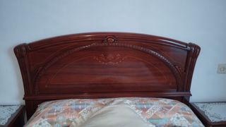 Muebles de dormitorio de madera con un diseño clásico y elegante. - Cabecero de madera con detalles tallados. - Mesitas de noche a juego. - Armario y comodin con espejo
