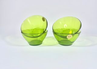 Conjunto original de 4 bowls DURALEX en cristal verde, fabricados en Francia. Diseño icónico, resistente y atemporal, muy buscado por coleccionistas y amantes del menaje vintage. Tres bowls están completamente nuevos y conservan su etiqueta original de Duralex. Uno presenta leves microarañazos y pequeños signos de uso, sin golpes ni fisuras. Medidas aproximadas: 13,5 cm de diámetro y 6,5 cm de altura. Cristal grueso y duradero, ideal para desayuno, ensaladas o decoración retro.