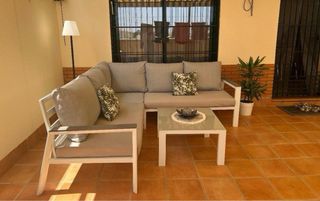 Vendo conjunto de mobiliario exterior compuesto por sofá rinconera y mesa de centro. Estructura metálica resistente (no se oxida) y cojines desenfundables en gris. Es súper estético y cómodo. Tiene muy poco uso y esta en muy buen estado.