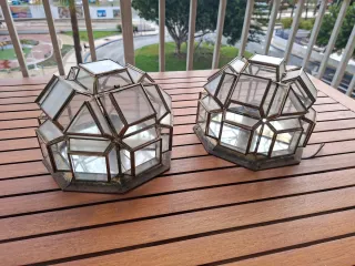 Originales apliques de estilo marroquí, perfectos para añadir un toque único a tu hogar. Su diseño geométrico y la combinación de materiales crean una atmósfera especial. -El precio es por unidad, los dos se quedan en 35 euros - Estructura metálica con acabado en cobre. - Paneles de cristal transparente. Hay uno ligeramente quebrado, puede verse en la foto pero es inapreciable. - Necesitan un repaso y limpieza