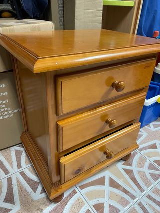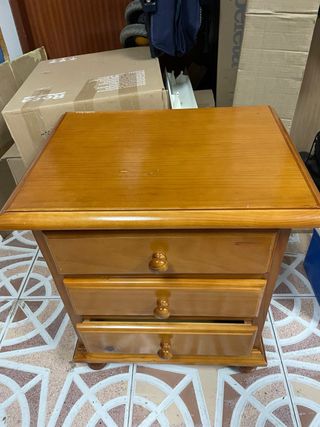 Mesita de noche fabricada en madera de pino. Cuenta con tres cajones para almacenamiento. - Diseño clásico y funcional. - Tiradores redondos de madera. - Patas redondeadas.
