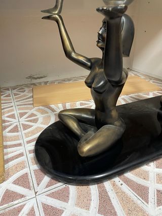 Elegante mesa de centro con una base decorativa de figuras. - Diseño único con figuras en bronce - Superficie de cristal transparente. -Base negra