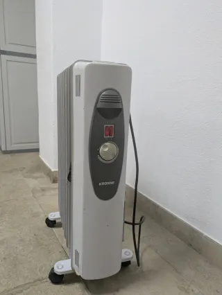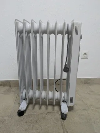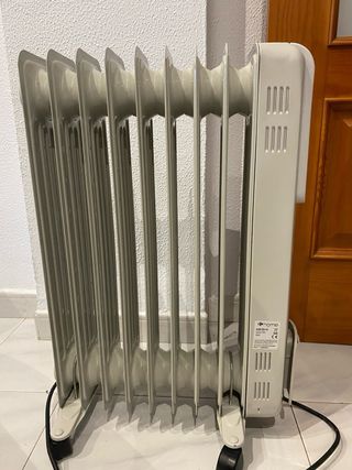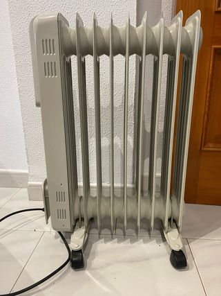 Radiador de aceite en color blanco, con ruedas para facilitar su movilidad. - Diseño de aletas. - Ruedas para transporte. - Cable de alimentación incluido.