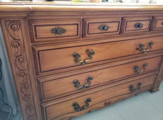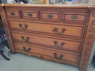 Cómoda cajonera de madera maciza con un diseño clásico y elegante. - Tiradores ornamentados. - Detalles tallados en los laterales. - Mueble robusto y duradero.