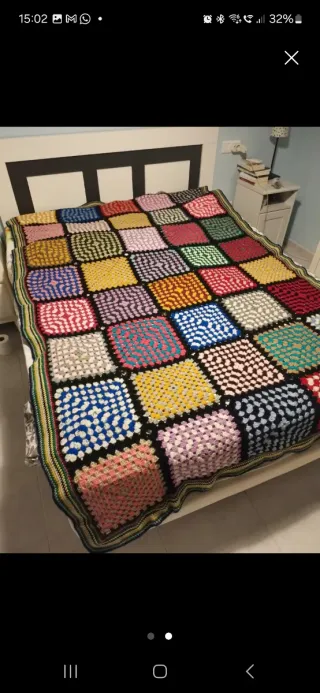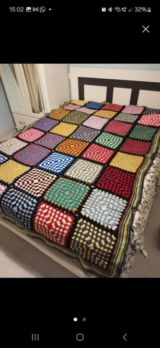 Manta artesanal tejida con lana de alta calidad. Su diseño a cuadros y sus vibrantes colores la hacen única. - Hecha a mano con técnica de ganchillo. - Patrón de cuadrados granny square. - Bordes decorativos.