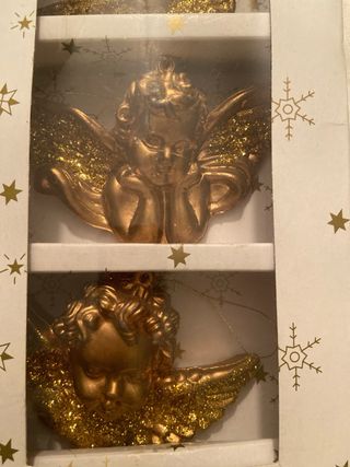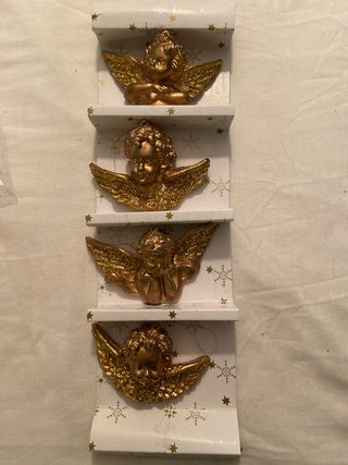 Conjunto de adornos navideños con figuras de ángeles. - Diseño en color dorado. - Base decorada con estrellas y copos de nieve.