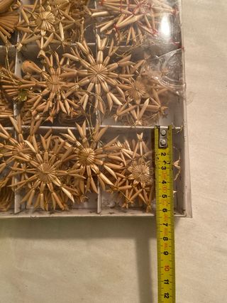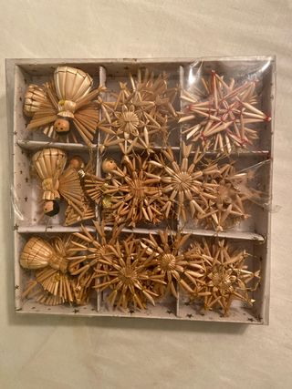 Conjunto de adornos navideños para árbol hechos de paja. - Diseño de ángeles y estrellas. - Tonos naturales de paja y detalles dorados.