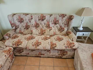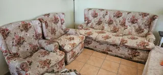 Conjunto de sofás vintage con un bonito estampado floral. Uno sofá de 3 plazas y 2 sillones - Tapicería de tela. - Tonos beige y rosa predominantes en el diseño.