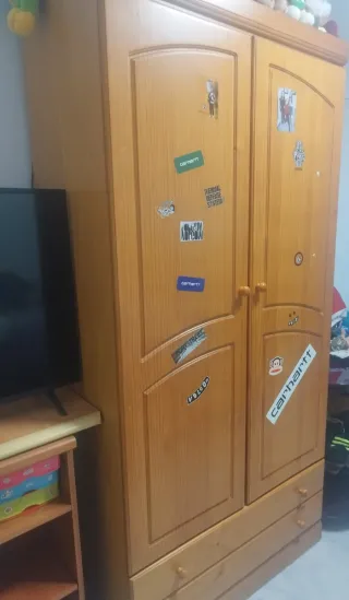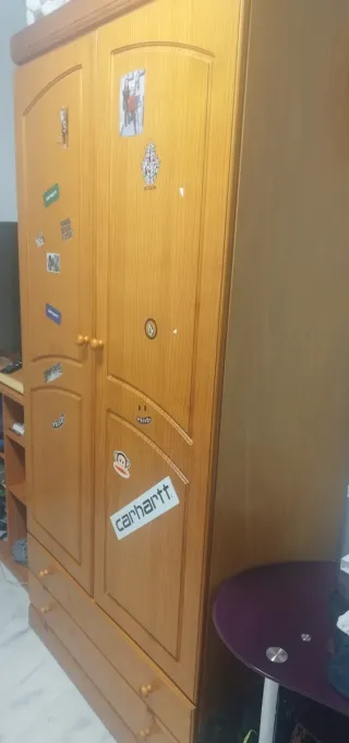 Armario de madera con un diseño clásico y funcional. Perfecto para organizar tu ropa y accesorios. - Dos puertas principales. - Tres cajones en la parte inferior. - Tiradores de madera. - Adhesivos decorativos incluidos.