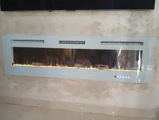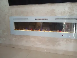 Elegante chimenea LED con un diseño moderno y minimalista. Aporta un toque acogedor a cualquier espacio. - Marco de cristal y metal - Efecto de llamas LED personalizable.