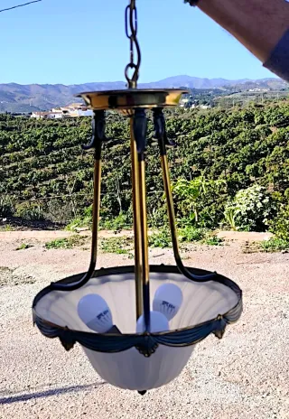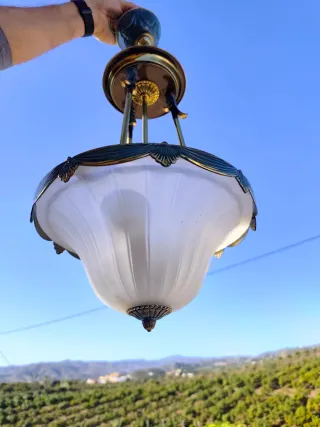 Elegante lámpara de techo con tres puntos de luz en forma de tulipa cristal en flor. - Diseño moderno y delicado. - Acabado plateado y blanco. - Incluye las tres bombillas. - Unos 45 cm de longitud. - Restos de pintura en la base pero colocada en el techo no se nota.