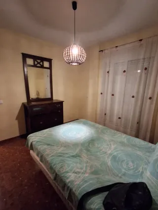 Muebles de dormitorio estilo Castellano, con un diseño clásico y elegante. - Cómoda de madera oscura con espejo. - Cabecero, somier tapiflex y dos mesitas - Lámparas mesitas y colgante decorativa.