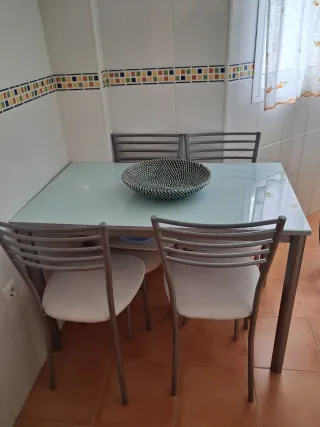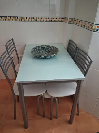 Mesa de cocina con sobre de cristal y estructura de metal. - Diseño moderno y funcional. - Patas metálicas resistentes. - Dispone de 4 sillas y 2 taburetes.