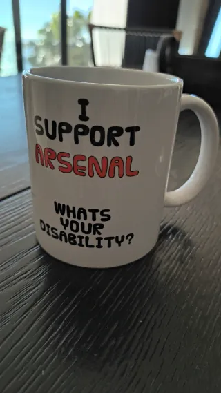 Taza con un mensaje divertido para los aficionados del Arsenal. - Diseño blanco con texto en negro y rojo. - Ideal para los amantes del fútbol.