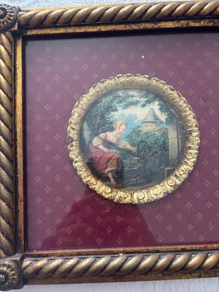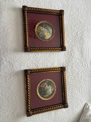 Elegante juego de dos cuadros decorativos con un diseño clásico. - Marco con acabado dorado y detalles trenzados. - Fondo de tela granate con pequeños motivos. - Imagen central circular con escena romántica. Los dos cuadros por50 euros