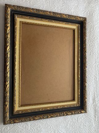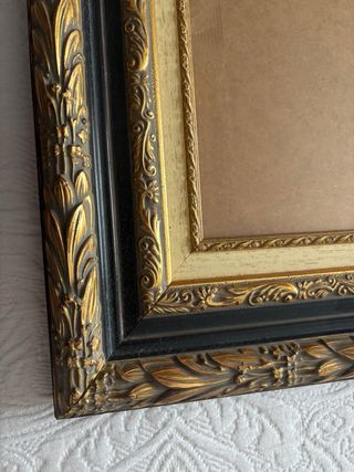 Elegante marco para cuadros con un diseño clásico y detallado. Combina acabados en dorado y negro para un toque sofisticado. - Marco con relieve ornamental. - Diseño de múltiples capas.