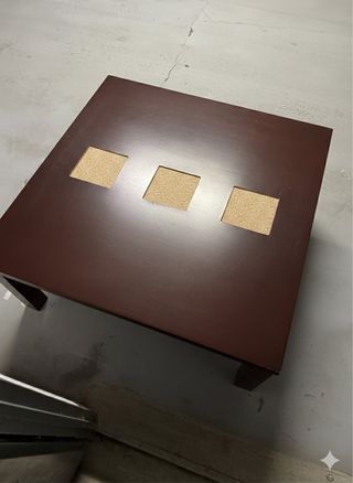 Mesa de centro de diseño moderno con un acabado en tono marrón oscuro. Presenta tres insertos cuadrados en la superficie. - Diseño cuadrado. - Tres huecos decorativos. -Tiene algún desperfecto como se ve en la imagen en una pata ,pero tiene muy buena estabilidad