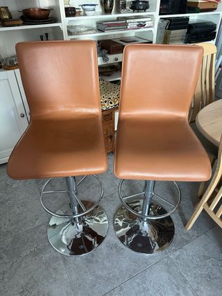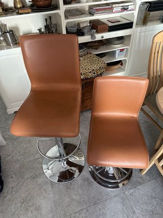 Conjunto de dos taburetes con un diseño moderno y funcional. NOTA TIENEN POCA PRESION LOS AMORTIGUADORES - Asiento y respaldo en acabado marrón. - Base y columna de acero. - Altura regulable. -altura máximo/mínima asiento 75 a 53 cm