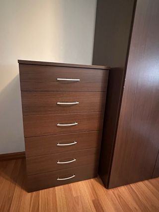 Se vende dormitorio completo. Consta de un gran armario, estructura de cama de matrimonio con somier de láminas de madera, mesitas de noche, cómoda y un perchero con espejo (para trajes y chaquetas) Esta en perfecto estado sin un rasguño. Solo el armario mide 2,15 de ancho por 2,25 de alto. - Color: marrón oscuro. - Material: madera y metal.