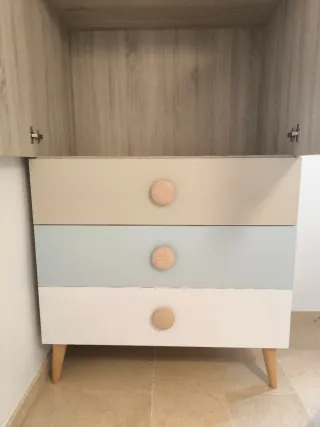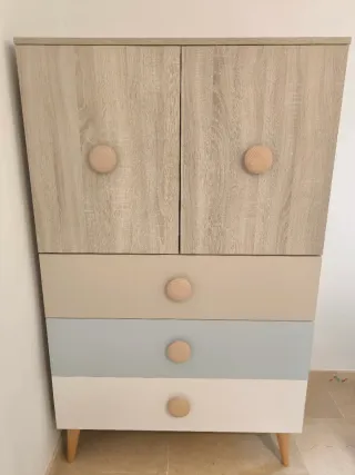 Armario juvenil con un diseño moderno y funcional. El armario está impecable y se podría hacer un pack con mesita de noche/zapatero, 2 cabeceros de cama, 2 canapés y 2 colchones a juego. El precio es negociable y si se vende el pack se puede dejar más económico. - Dos puertas superiores. - Tres cajones inferiores muy amplios. - Tiradores redondos de madera.