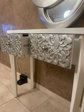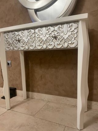 Elegante mesa de entrada con un diseño moderno. - Patas blancas con forma. - Cajones con relieve ornamental plateado. ✅OFERTA ESPEJO+ MESA 149€✅