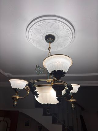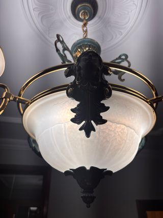Elegantes lámparas de diseño con acabados en oro y cristal. Ideal para dar un toque especial a tu hogar. - Estructura metálica dorada. - Pantallas de cristal blanco. - Diseño único para recibidores y escaleras. Son 2 lamparas compañeras pero independientes . El precio por unidad es de 60€