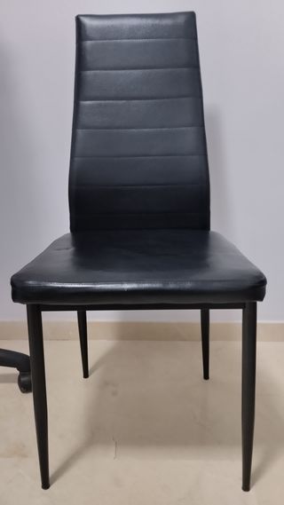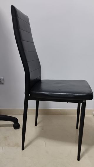 Conjunto de sillas con un diseño moderno y elegante. - Patas metálicas resistentes. - Asiento y respaldo acolchados en piel sintética. El unico inconveniente que los tornillos se afloja. De vez en cuando y la silla se mueve. Pero no se cae