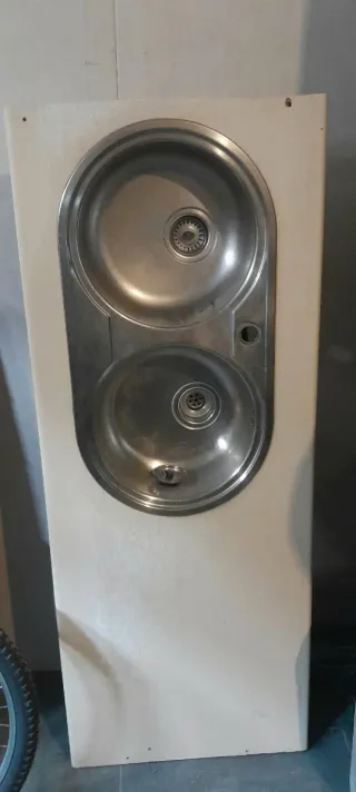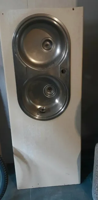Fregadero de acero inoxidable con dos cubetas y encimera. - Material: Acero inoxidable. - Diseño: Doble cubeta. - Incluye encimera de madera de 155cm