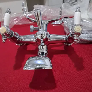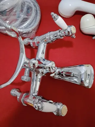 Grifo para bañera con función de ducha, estilo vintage. - Acabado en plata y blanco. - Fabricado en metal y plástico.