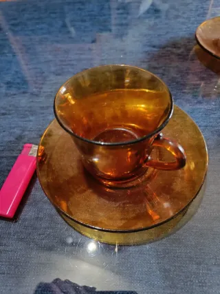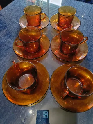 Conjunto de seis tazas de desayuno con sus platillos. - Diseño elegante y moderno. - Material resistente y duradero. - Color ámbar translúcido.