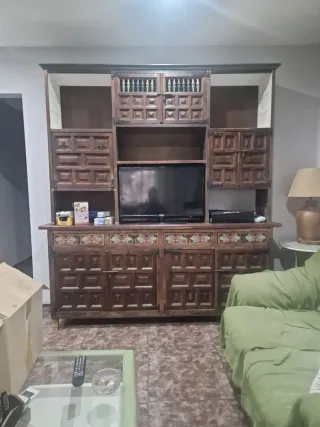 Mueble de salón en muy buen estado, madera de alta calidad, sin raspones ni rallajos. Es modular por lo que se puede colocar como mejor venga y para un fácil traslado. La suma de todos los muebles es de 3'30m. Esa compuesto por cajoneras, vitrina de cristal, armario con baldas, botellero, librería y estantes. Se regala para quien lo quiera la madera de la pared.