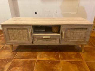 Mueble de televisión con un diseño moderno y cálido, combinando madera y detalles de ratán. Precio original 120€. - Acabado en color madera natural. - Puertas con paneles de ratán. - Cajón central con tirador de madera. - Patas cónicas de madera. Lo único que tiene es un tirador un poco mordido por mi perro, adjunto foto, lo demás está perfecto.