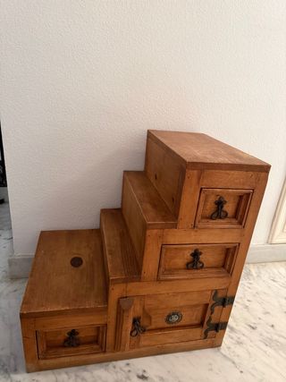 Original mueble de madera maciza con diseño de escalones y múltiples compartimentos. - Diseño de escaleras. - Cajones y puertas con tiradores ornamentales. - Acabado en madera natural. Se pueden comprar por separado (100€) o juntas (190€)
