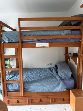 Litera de madera maciza con un diseño robusto y funcional. Incluye una cama supletoria que se extrae fácilmente. - Estructura de madera maciza. - Cama supletoria integrada. - Incluye: - Colchón nuevo con 3 años (utilizado 1 solo año). - Colchón antiguo pero con poco uso. - Colchón supletorio antiguo. - Sabanas una por cama (no incluye sabana de la cama extraíble) - 4 almohadas con fundas - Litera - 196 (de largo) x120 (de ancho) x 212 (de alto) - Cama supletoria - 180 (largo) x 80 (ancho) x 22 (alto)