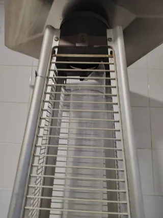 Estufa de gas de exterior, ideal para terrazas de bares o restaurantes. Su diseño alto y estilizado la hace muy práctica. - Estructura metálica. - Cubierta superior de acero inoxidable.