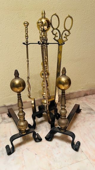 MORRILLOS Y CONJUNTO HERRAMIENTAS CHIMENEA Elegante conjunto de útiles para chimenea con detalles ornamentales, es muy robusto, como los de antes, tiene señales de uso y precisamente eso le garantiza su resistencia al fuego y autenticidad dándole un verdadero toque rústico. El precio incluye todo lo que ves en las fotos más la pantalla protectora en fotografía aparte: 2 morrillos, la pala, el cepillo, el atizador, las pinzas, el soporte y la pantalla protectora dorada. Medidas: Soporte: alto 73cm, ancho del pie 26cm Morrillos alto 45cm, fondo 38cm, ancho 20 Pantalla protectora: alto 65, ancho 65, patas fondo 18cm