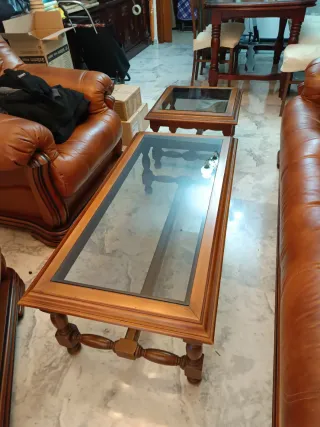 Conjunto de mesas de madera con superficie de cristal. - Mesa principal de centro rectangular. - Mesa auxiliar cuadrada. - Diseño clásico y elegante.