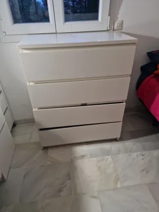 HAY QUE ARREGLAR LOS DOS CAJONES DE ABAJO!!!!! Cómoda de cuatro cajones de la marca Ikea. - Diseño moderno y funcional. - Acabado en color blanco. - Fabricada en madera.