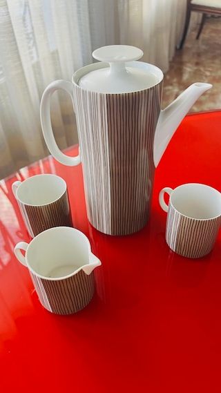 Moderno conjunto de porcelana alemana de alta calidad de la prestigiosa marca Thomas (Grupo Rosenthal), diseño minimalista y elegante, típico de la era Space Age/Mid-Centuty, destaca por su patrón de finas líneas verticales en tonos tierra y silueta estilizada. Set de 4 piezas que incluye su Cafetera/Tetera alta con tapa, 1 Lechera/Jarra pequeña y 2 tazas de café/té. En buen muy buen estado de conservación, sin grietas ni desconchones. Tetera alto 17cm, 9 diámetro Tazas alto 6cm