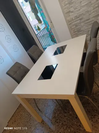 Conjunto de mesa con sobre de cristal y cuatro sillas. - Estructura de la mesa en metal y cristal templado. Medidas: 75x120 - Sillas con asiento blanco y patas de madera.