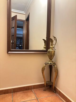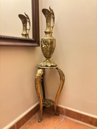 Elegante conjunto de jarrón y mesa auxiliar con un diseño intrincado. - Jarrón de bronce con detalles ornamentales. - Mesa de bronce con patas curvas y detalles tallados.