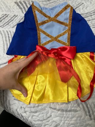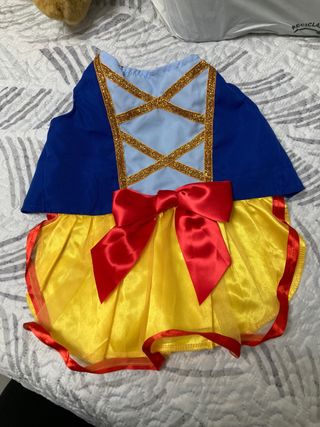 Adorable disfraz de Blancanieves para tu mascota. Perfecto para ocasiones especiales o para divertidas fotos. - Diseño inspirado en Blancanieves. - Colores vibrantes: azul, amarillo y rojo. - Detalle de lazo rojo. - Acabado brillante.