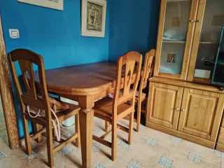Conjunto de muebles de comedor de madera de pino. Incluye vitrina alta, mueble de televisión con cajones y armario lateral. - Vitrina con puertas de cristal y estantes interiores. - Mueble central con tres cajones amplios. - Armario lateral con puerta de cristal y estantes. - Acabado en madera natural,de pino.Imcluye la mesa y seis sillas a juego, lámpara y reloj de pared.Todo por 850€