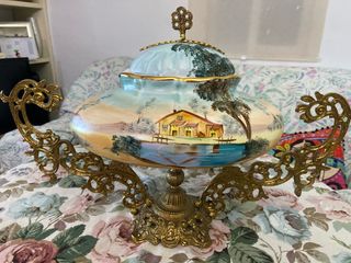 Elegante centro de mesa con un diseño pintado a mano. - Pieza central de porcelana con detalles dorados. - Base y asas decorativas de metal con acabado dorado. - Pintura paisajística con casa y agua.