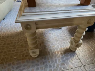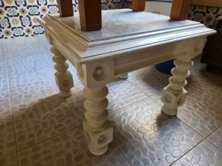 Elegante mesa antigua con un diseño clásico. - Tablero de mármol. - Patas de madera tallada con un acabado blanco. - Detalles decorativos en los soportes.