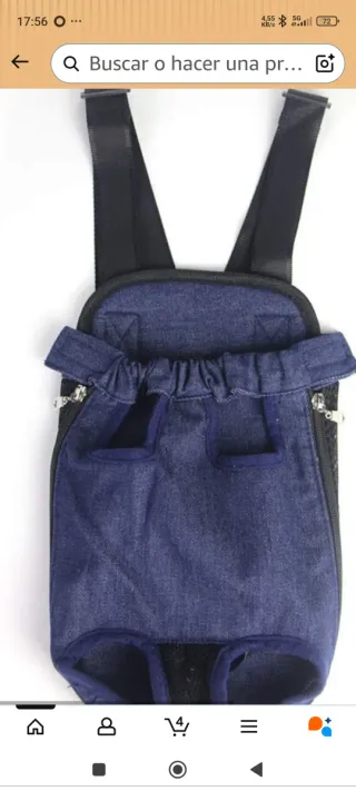 Transportín de tela vaquera para llevar a tu mascota contigo. Es cómodo y práctico. - Diseño tipo peto. - Tirantes ajustables. - Cremalleras laterales.