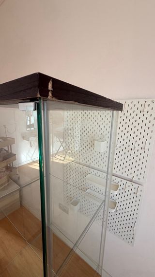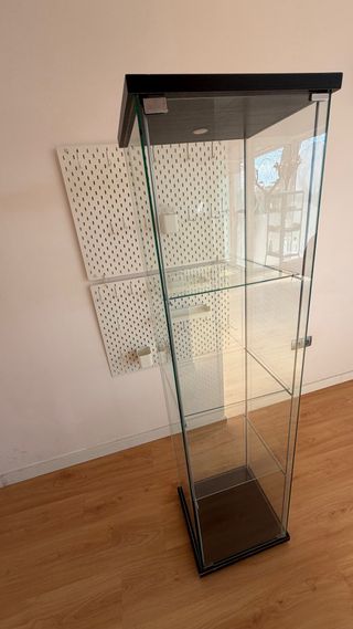 Vitrina de diseño moderno con estructura de madera y cristal. - Acabado en negro y transparente. - Estantes de cristal. - Puerta con cierre. Está desgastada del uso pero se puede pintar o vinilar No se envia por la complejidad de transportar un mueble asi