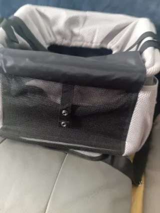 Transportín o mochila de paseo para mascotas con base rígida. Es, además, un accesorio para bicicleta porque se puede enganchar como si fuera una cesta de bicicletas. Está en perfecto estado de conservación ya que se la ha dado muy poco uso.