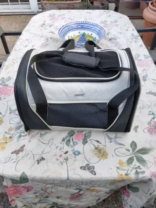Transportin Zoofari para perros y gatos. Adecuado para las visitas al centro veterinario y para viajar en compañía de tu mascota. Destaca por su ligereza y facilidad de ser desmontado, de ser limpiado y de ser plegado, muy funcional. Diseño con ventilación en malla y cierre de cremallera. Asas de transporte cómodas y unificables. Fabricado en Alemania. Medidas: 45 de largo, 27 de ancho, 28 de alto. Peso máximo recomendado: 6.5kg. Poco uso. # Transporte Porte Montacargas Enganche Maletero Mascota Pet Perro Canino Gato Gatuno Animal Doméstico Animales Veterinaria