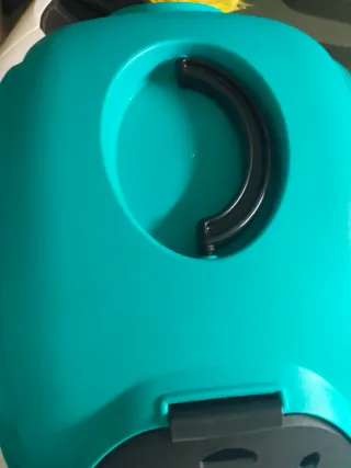 Transportín en buen estado, ideal para perros o gatos. Su diseño combina negro y verde, ofreciendo un aspecto moderno. - Puerta frontal con rejilla. - Asa superior para facilitar el transporte. - Ventilación lateral. Ligero, resistente y fácil de limpiar!